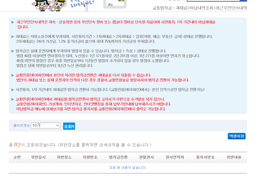 - 교통범칙금, 과태료 -> 미납내역조회 -> 최근무인단속내역