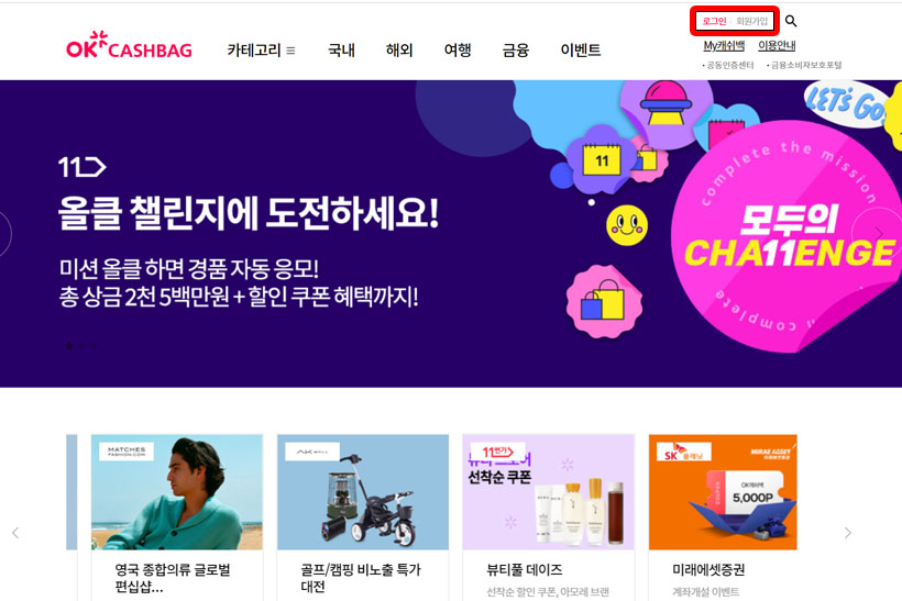 먼저 OK캐쉬백 홈페이지에 접속을 하여서 로그인을 하여 주세요. PC나 모바일 모두 동일하게 가능합니다.