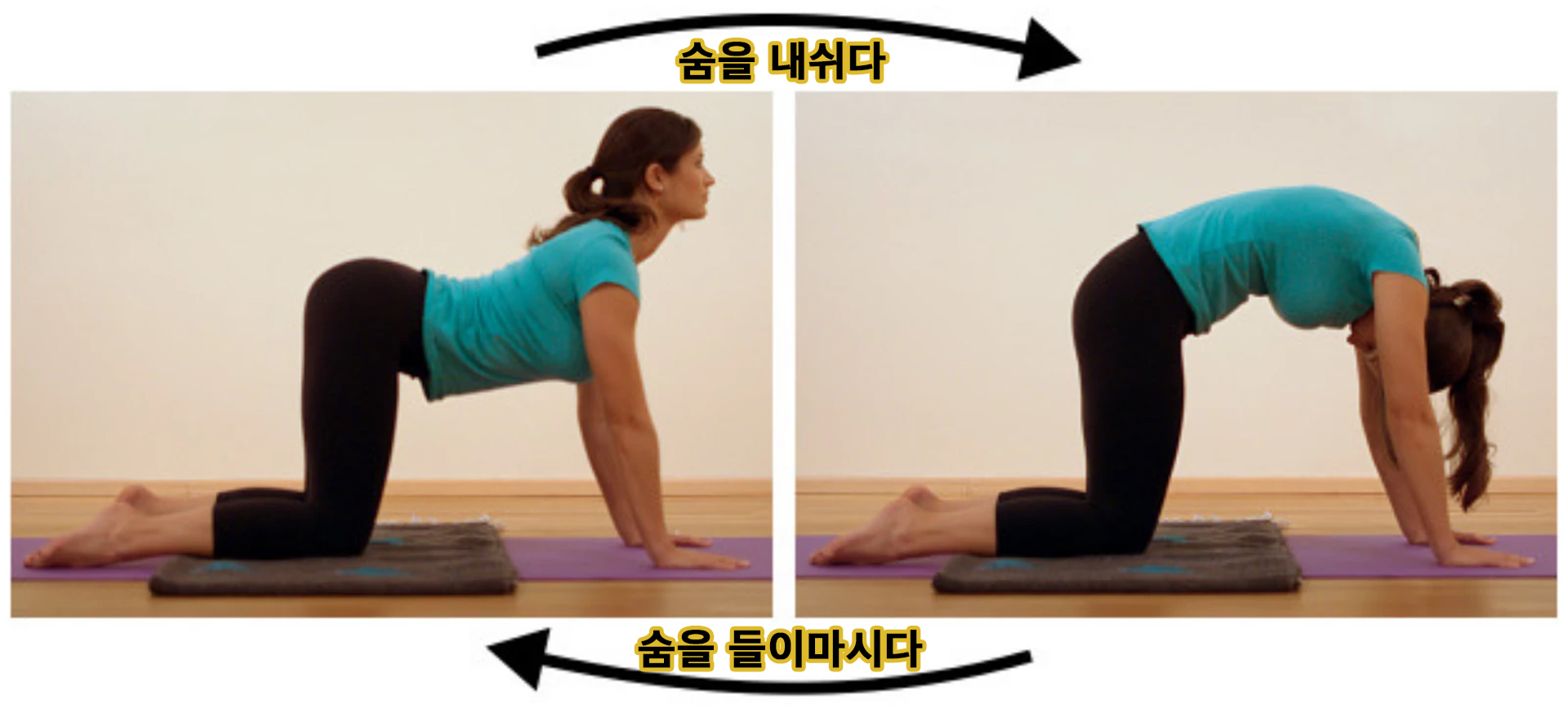 고양이-소 자세는 요가의 기본 자세 중 하나로, 척추를 유연하게 하고 허리의 긴장을 풀어줍니다.